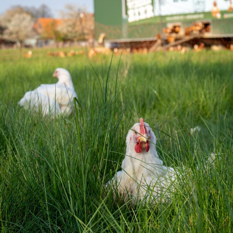 Unsere Hähnchen leben in mobilen Ställen auf wechselnden