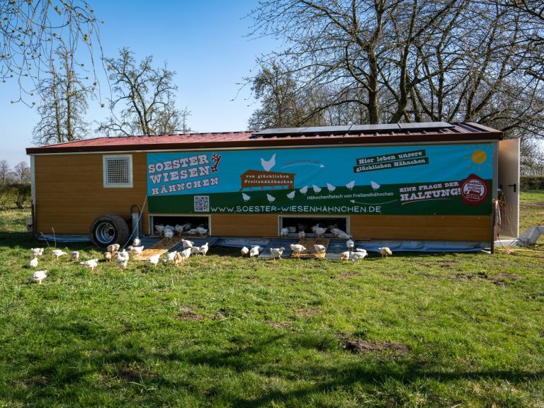 Unsere mobilen Ställe werden regelmäßig versetzt, sodass die Tiere immer Zugang zu frischen Wiesenflächen haben.